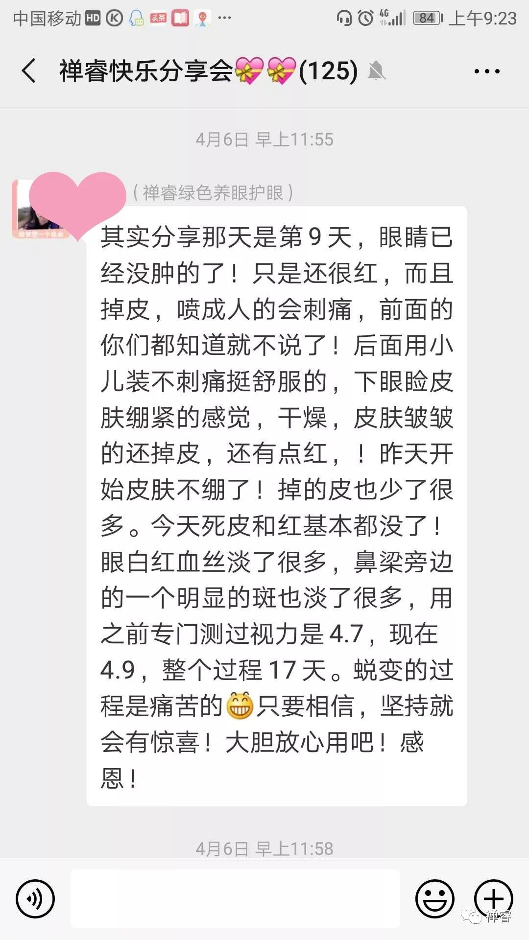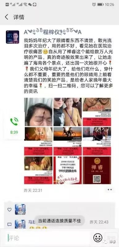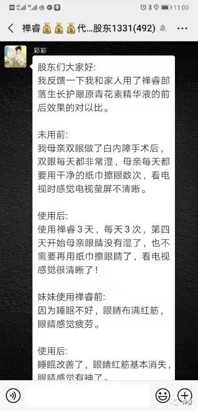 自己用了禅睿后,犹豫长期看手机导致的眼睛白雾和模糊消失了; 自己的母亲用了后,不再流眼泪,还能看清电视机上的字幕! ----禅睿健康 |