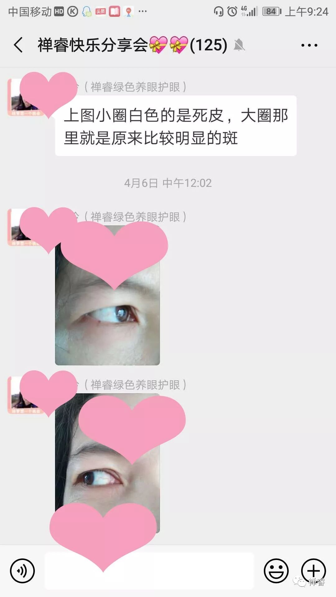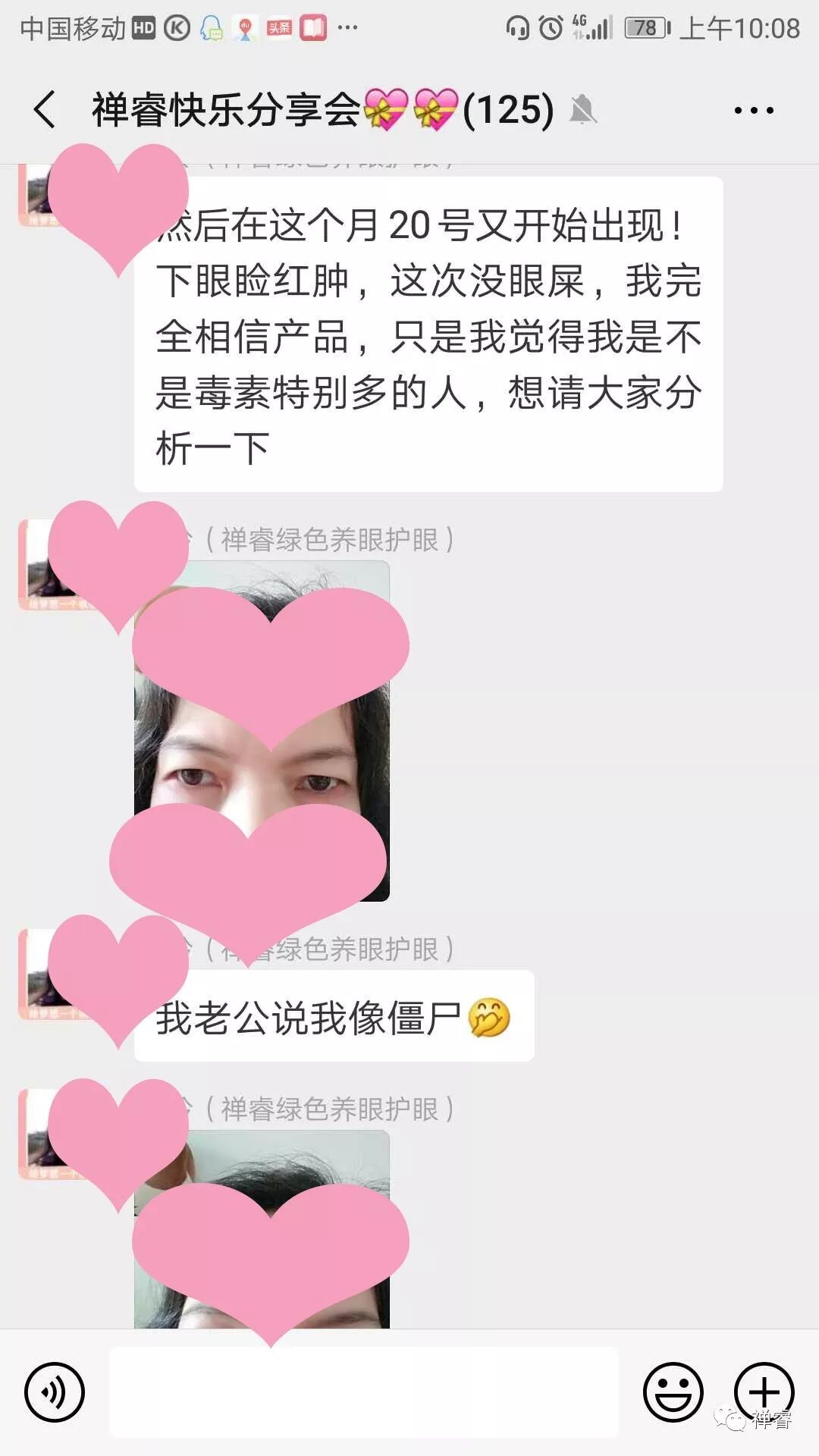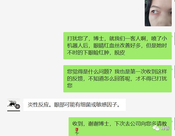 平台客服收到后,和技术专员探讨了下,发现燕子的眼睛红血丝和黄斑减轻甚至消失了,但下眼睑还确实存在红肿现象,提出初步建议:眼周围的皮肤比较脆弱,可能对产品有过敏现象,眼球部分有明显好转现象,但鉴于下眼睑不舒服,先暂停使用,并将燕子的情况反馈到禅睿健康研发团队。