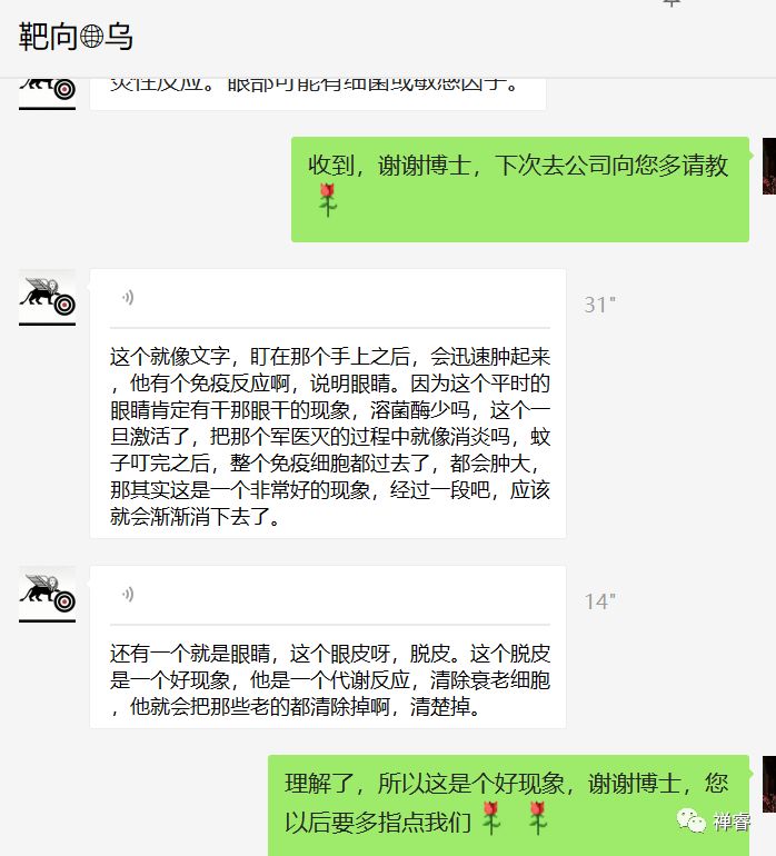 九天后,我们很高兴地收到燕子的反馈:后续眼睛慢慢不刺痛了,下眼睑皮肤有点紧绷干燥,并伴随脱皮现象。