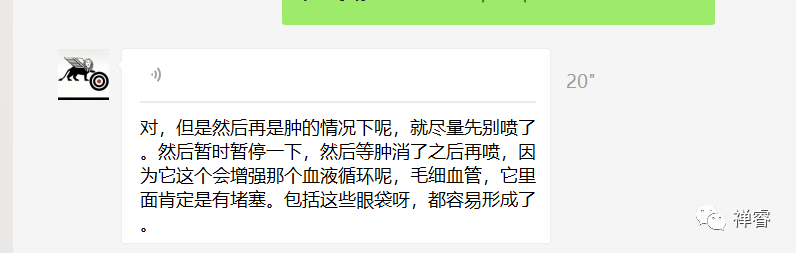十二天后,又开始重复之前的一些症状:眼屎多,喷完眼睛刺痛、流泪,眼睛下眼睑稍红,肿。这次持续了八天,燕子感觉很不舒服,不明确是出了什么问题,但她还是相信产品,坚持继续使用。